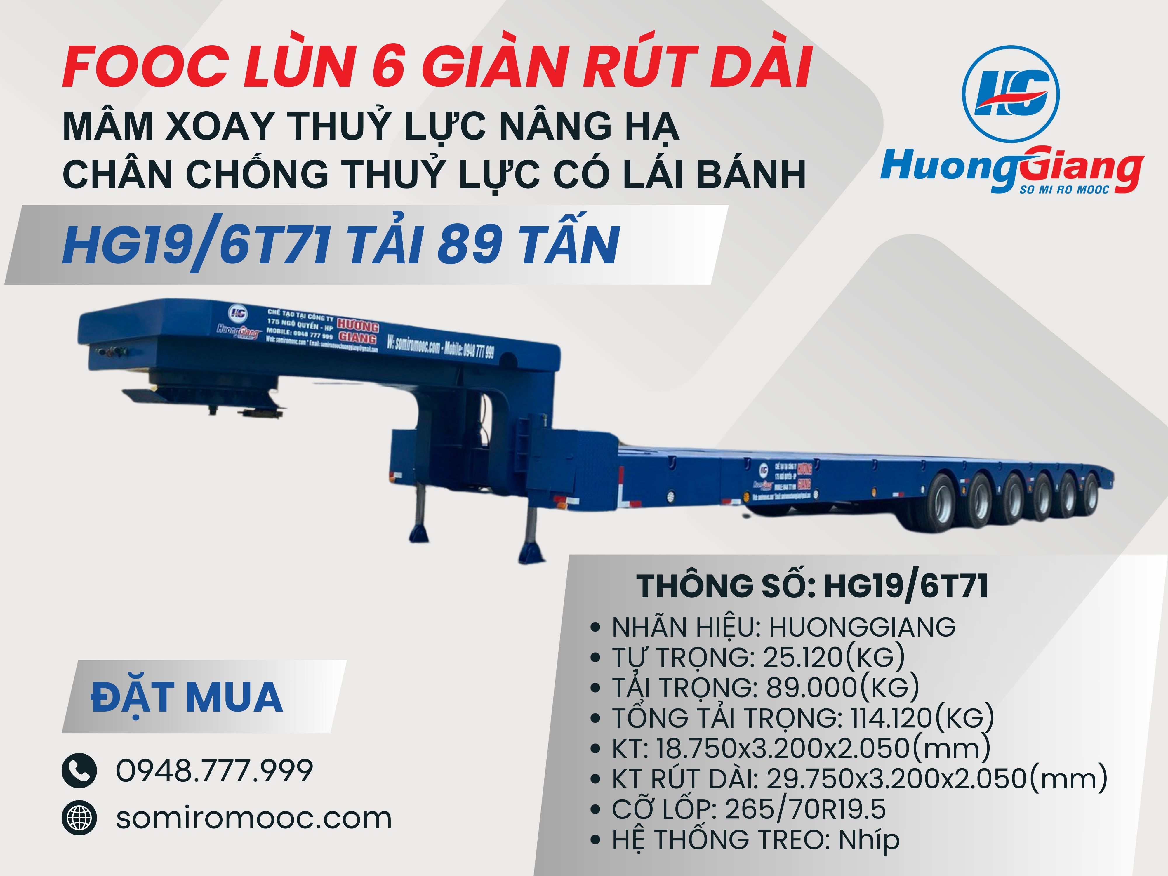 Fooc 6 giàn rút dài sàn phẳng ngang 3.2 mét, có đánh lái mâm trục, mâm xoay - chân chống thuỷ lực - HG19/6T71