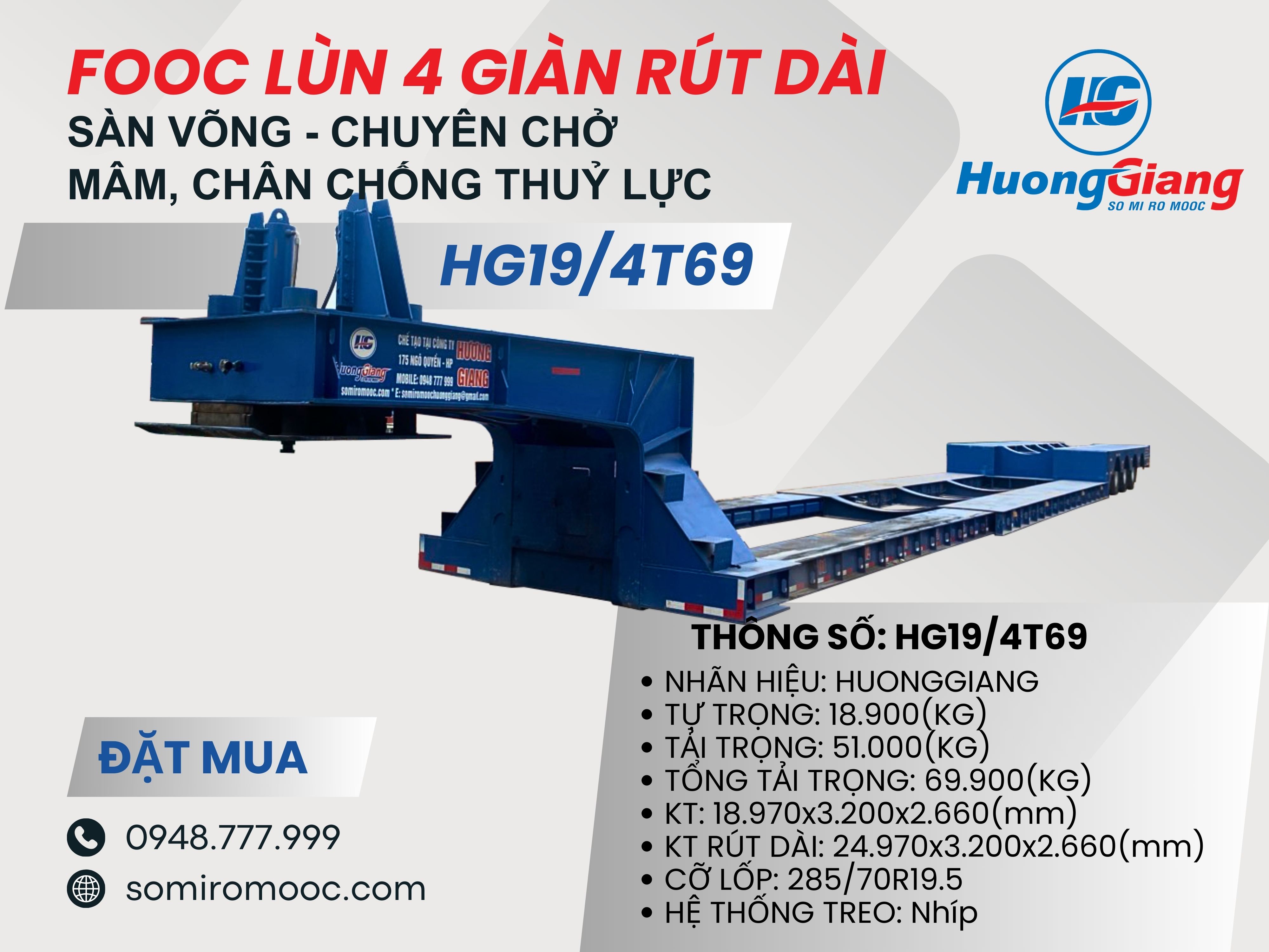 Fooc lùn rút dài 4 giàn sàn võng, mâm xoay chân chống thuỷ lực chuyên chở bồn, téc - HG19/4T69